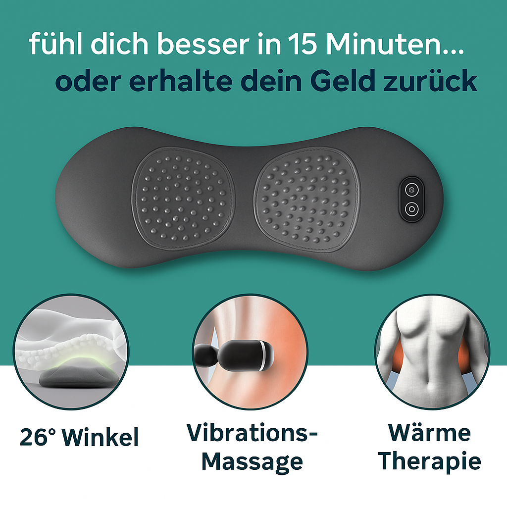 Das innovative 3-in-1 Massagegerät kombiniert Wärmetherapie, Vibration und Druckentlastung, um Verspannungen sanft zu lösen und die Muskulatur zu lockern.